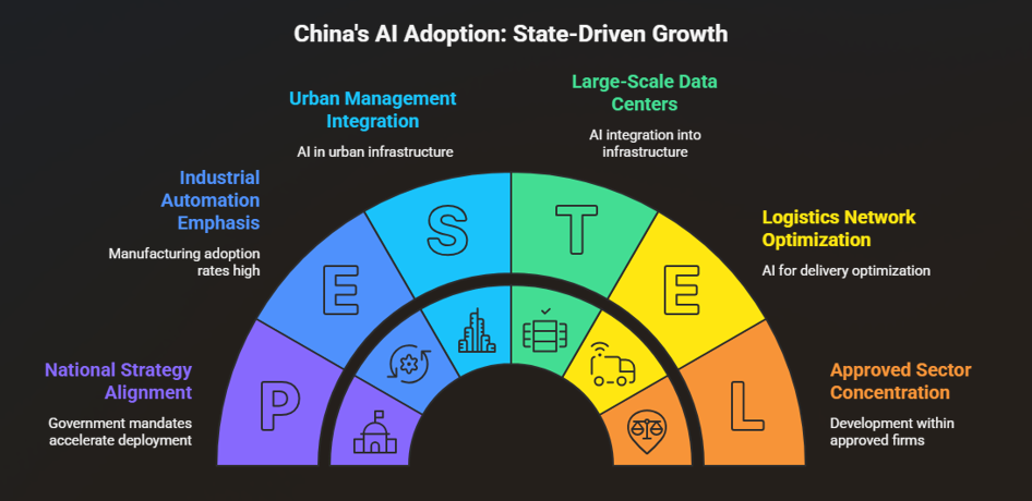 Public services also play a significant role. Government agencies deploy AI for traffic management, urban planning, and service delivery, normalizing usage across sectors. This creates a feedback loop: as the state adopts AI, private firms follow.