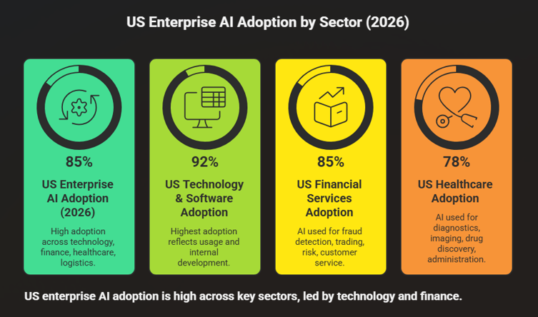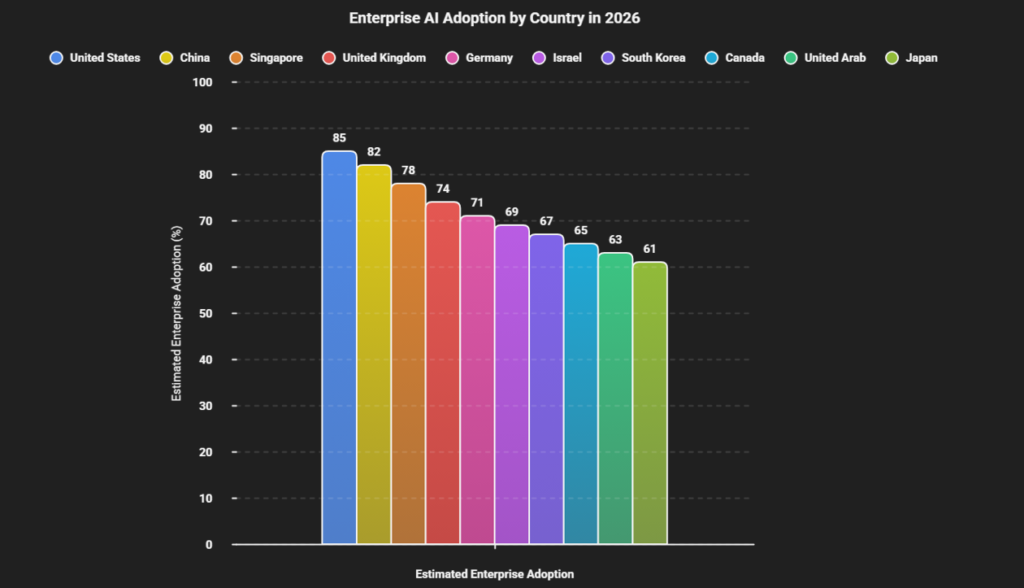 The United States leads global AI adoption largely because it already possessed the prerequisites. Massive venture capital markets, dominant technology firms, and deep research universities created an environment where AI could move quickly from lab to deployment. By 2026, enterprise AI adoption in the US has reached approximately 85 percent, with technology, finance, healthcare, and logistics at the forefront.