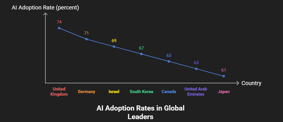 The United Arab Emirates, around 63 percent, leverages oil-funded diversification and smart city initiatives. Japan, at approximately 61 percent, adopts AI more cautiously, balancing automation with cultural and labor considerations.